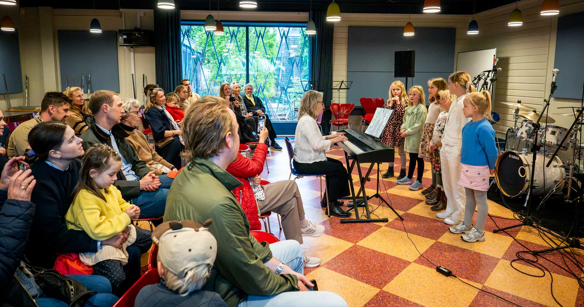 På alle Frederiksberg Kommunes folkeskoler underviser vi i Musik og Bevægelse på 1. og 2. klassetrin. Disse hold samles til denne festlige sangforestilling med et lærerband, der spiller til sangene. (Frederiksberg, Musikhøjskolen)